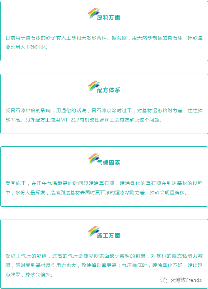 真石漆因材質(zhì)環(huán)保天然,成本較低且美觀大方而受到建筑裝修行業(yè)廣為使用,但在施工時(shí)出現(xiàn)的掉砂現(xiàn)象,也是讓人頭痛的事情。